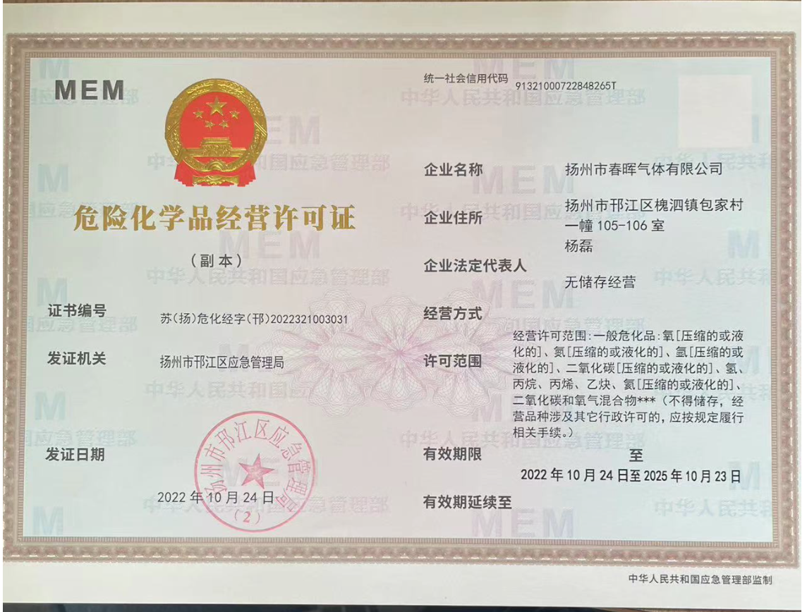 揚(yáng)州市春暉氣體有限公司于1993年揚(yáng)計(jì)經(jīng)(93)技字第042號(hào)文批準(zhǔn)生產(chǎn)工業(yè)氧氣、氮?dú)夂投趸肌F髽I(yè)擁有固定資產(chǎn)3000多萬元,占地面積15000m2,建筑面積7000 m2,職工總?cè)藬?shù)68名,初級(jí)職稱人員10名,高級(jí)職稱人員2名,各種特種作業(yè)持證人員20名。  企業(yè)下設(shè)2個(gè)分公司及1個(gè)鋼瓶檢驗(yàn)站。即春暉氣體有限公司酒甸分公司、春暉危險(xiǎn)品運(yùn)輸有限公司、無縫氣瓶檢驗(yàn)站。主要生產(chǎn)經(jīng)營(yíng)產(chǎn)品有:液化及瓶裝氧、氮、氬、二氧化碳、乙炔、丙烷、液化天然氣、混合氣及各種高純氣體、干冰、鋼瓶...【查看更多】